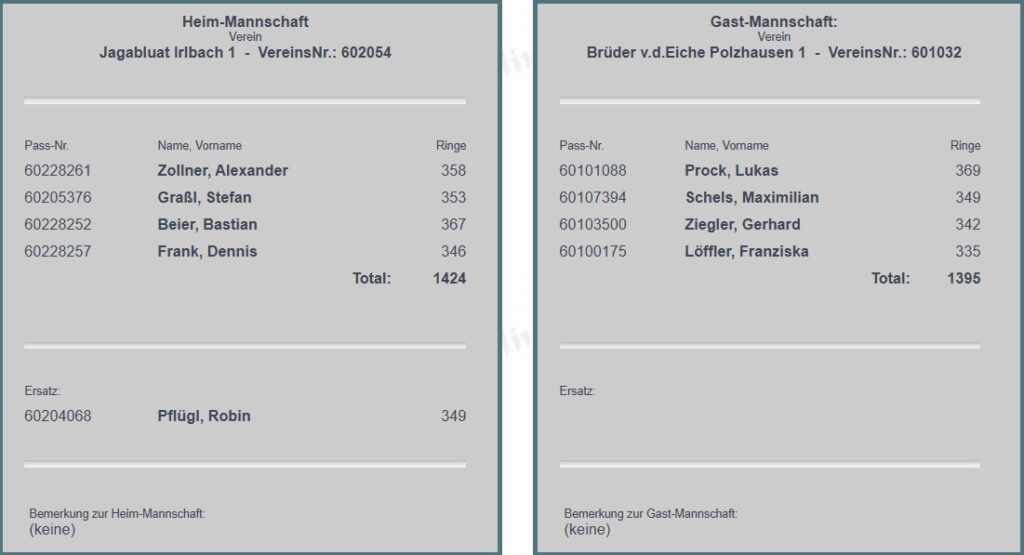 Mit einem starken Mannschaftsergebnis von 1424 Ringen behielten wir die Oberhand und ließen den Gästen, die auf 1395 Ringe kamen, keine Chance auf die Punkte.