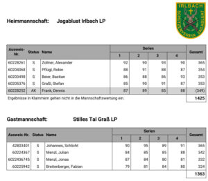 Unsere LP Bezirksliga Mannschaft hat auch ihren 5. Kampf gewonnen und steht mit 10:0 Punkten weiterhin ungeschlagen auf Platz 1 der Tabelle! Im Aufeinandertreffen mit dem Team Drei Tannen Lehen