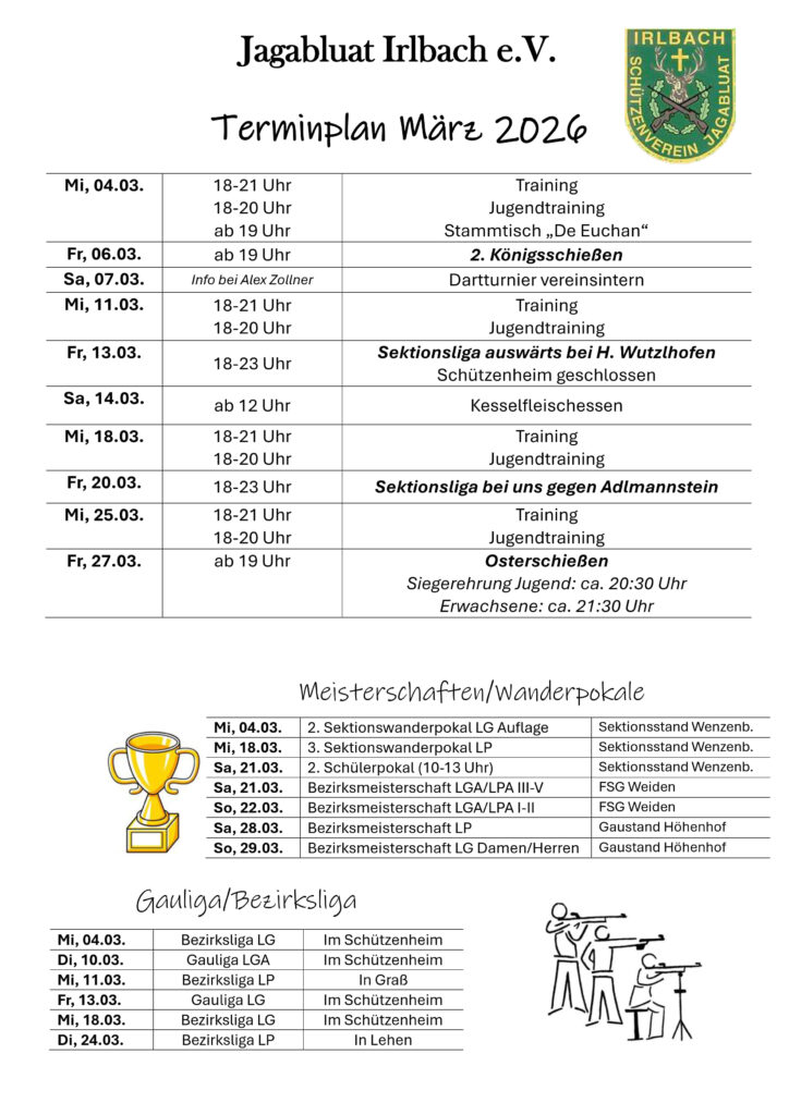 Der März bei wird sportlich und gesellig! Unser neuer Terminplan ist da und verspricht volles Programm: Von den wöchentlichen Trainingseinheiten über spannende Sektionsliga-Wettkämpfe bis hin zu unseren traditionellen Highlights wie dem Kesselfleischessen und dem Osterschießen. Packt eure Ausrüstung ein – wir sehen uns im Schützenheim!