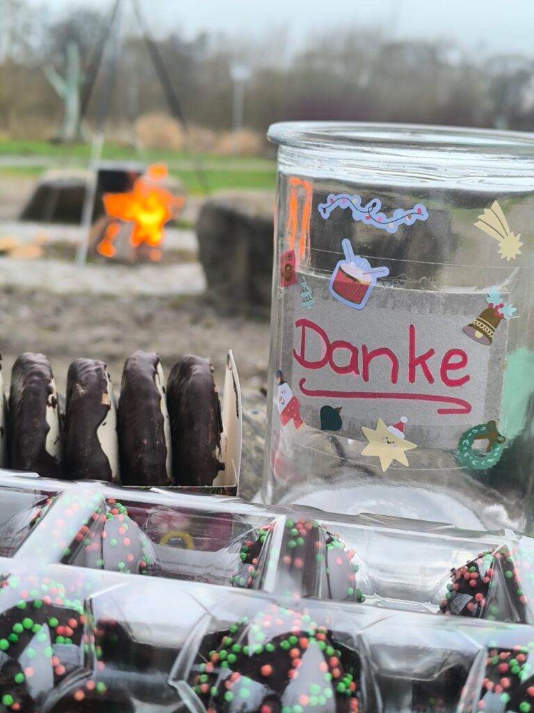 Nach etwa einer halben Stunde Wanderung wartete dort schon ein gemütliches Lagerfeuer auf uns. Besonders schön: Der Glühwein wurde ganz traditionell in einem Kessel über dem Feuer auf einem Dreibein erwärmt – ein echter Hingucker und natürlich auch geschmacklich etwas Besonderes. Für die Kinder gab es Kinderpunsch, dazu wurden fleißig Plätzchen und Lebkuchen geteilt, die einige Mitglieder mitgebracht hatten.
