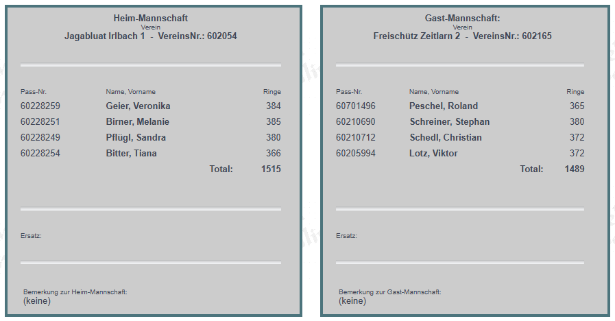 Am 4. März 2026 gewann unsere LG 1 im Heimkampf in Irlbach den vorletzten Wettkampf der Saison 2025/2026 in der Bezirksliga Süd A gegen den Freischütz Zeitlarn deutlich mit 1515 : 1489 Ringen (Differenz 26 Ringe).